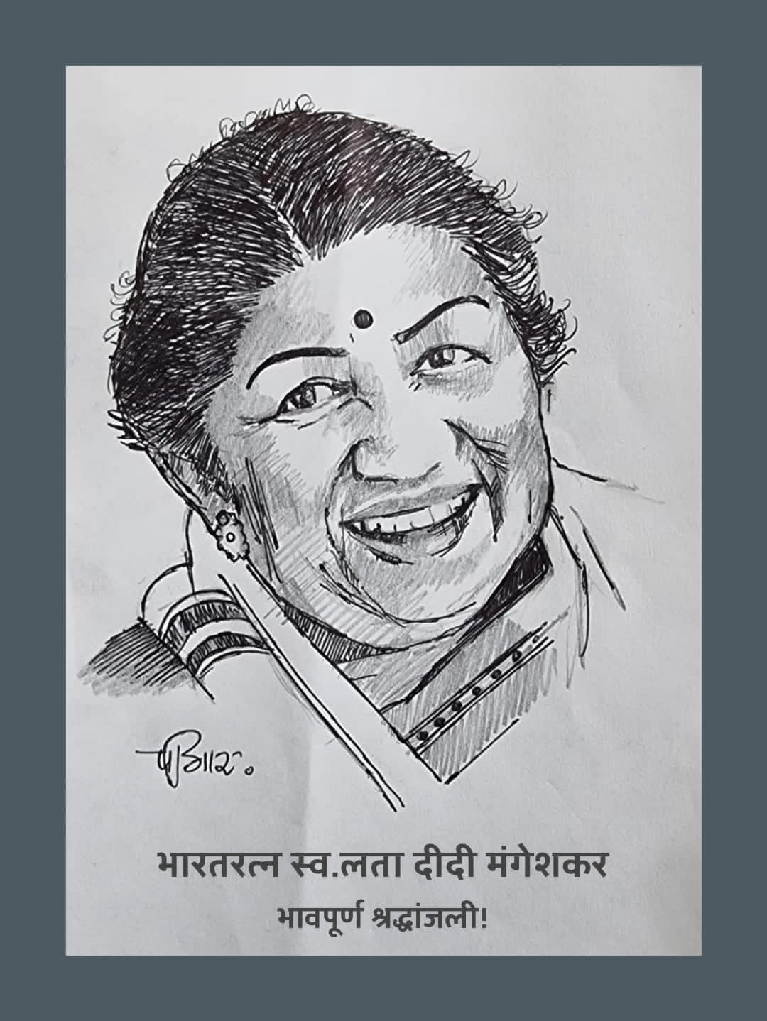 भारतरत्न आणि भारताच्या गानकोकिळा म्हणून प्रसिद्ध असलेल्या लता मंगेशकर यांचं आज निधन झालं.वयाच्या ९२ वर्षी त्यांनी अखेरचा श्वास घेतला. रुग्णालयात उपचार सुरू असतानाच त्यांची प्राणज्योत मालवली. लता मंगेशकर यांच्या निधनामुळे संपूर्ण कलाविश्वावर शोककळा पसरली आहे. अनेक दिवसांच्या उपचारांनंतर त्यांनी करोनावर मातही केली होती. यानंतर त्यांची प्रकृती सुधारल्यामुळे त्यांची कृत्रिम श्वसनयंत्रणा काढण्यात आली होती. मात्र, आज सकाळी त्यांची प्रकृती पुन्हा खालावल्याने त्यांना पुन्हा कृत्रिम श्वसनयंत्रणेवर ठेवण्यात आले. अखेर आज अखेरचा श्वास घेतला.त्याच्या निधनाने शोककळा कोसळल्याने अनेक मान्यवरांनी त्यांना श्रध्दांजली अर्पण करीत आहेत अशातच संवेदनशिल मनाचे,चित्रकार असलेले नंदुरबार जिल्ह पोलीस अधिक्षक पी.आर.पाटील यंानी लतादिदींचे पेन्सील व पेनच्या सहाय्याने रेखाचित्र रेखाटुन आगळी वेगळी श्रध्दांजली अर्पण केली. पोलीस अधिक्षक पी.आर.पाटील यांनी पेन व पेन्सीलव्दारे अवघ्या २० ते २५ मिनीटांत ५ बाय १० से.मि.चे  रेखाचित्र रेखाटले.त्यांनी रेखाटलेल्या रेखाचित्रात जिवंतपणा वाटतो.