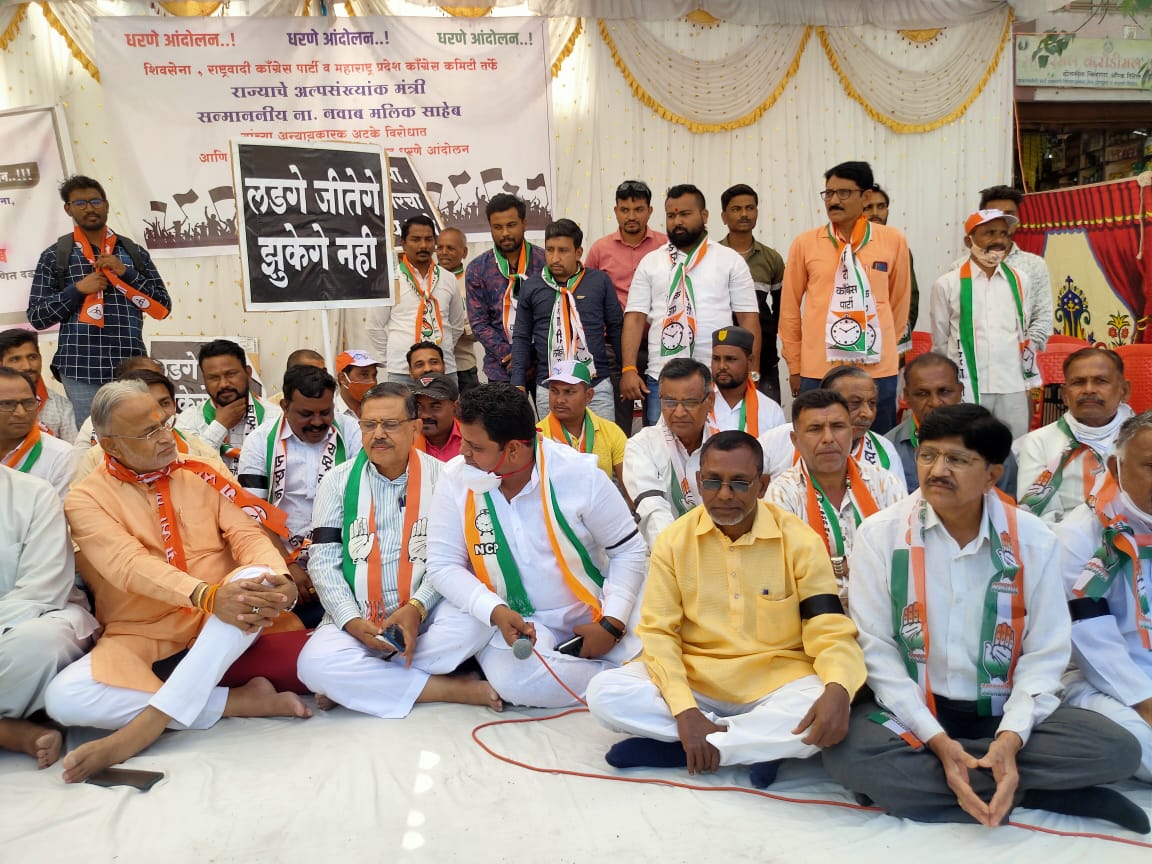 अल्पसंख्यांक मंत्री नवाब मलिक यांना मुंबई बॉम्बस्फोटातील आरोपी कडून कवडीमोल भावाने जमिनी विकत घेतल्या प्रकरणात केंद्र सरकारच्या अंमलबजावणी संचालनालयाच्या वतीने चौकशी करून अटक केल्याच्या निषेधार्थ महाविकास आघाडीच्या वतीने भाजप सरकारचा निषेध करण्यात आला. यावेळी भाजपा हमसे डरती है ईडी को आगे करती है. केंद्र सरकारचा निषेध असो अशा घोषणा देण्यात आल्या. नवाब मलिक तुम संघर्ष करो हम तुम्हारे साथ है. अशा आशयाचा घोषणा देऊन केंद्रीय भाजप सरकारचा निषेध व्यक्त करण्यात आला. एकूणच गेल्या काही काळापासून केंद्रीय भाजप सरकारने महाराष्ट्रातील महाविकास आघाडीच्या नेत्यांच्या मागे ईडी द्वारे चौकशी सुरू केल्याने राजकीय वातावरण ढवळून निघाले आहे.