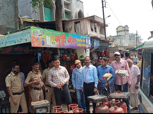 नंदूरबार येथील शास्त्री मार्केट परिसरात महसूल विभागाच्या अधिकाऱ्यांनी आज बुधवारी दुपारी दीड वाजेच्या सुमारास दोन दुकानांमध्ये अनाधिकृतपणे घरगुती सिलेंडर रिफिलिंग करणाऱ्यांवर छापा टाकून सिलेंडर व वजन काटे आणि गॅस भरणारी विद्युत मोटार असा मुद्देमाल जप्त करत दोन दुकानांना सिल केले आहे.