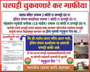 गेल्या दोन वर्षात कोरोना काळात लाॅकडाऊन मुळे व्यावसायिक व सामान्य नागरिकांची आर्थिक परिस्थिती पूर्णता खालावल्याने विविध कर व घरपट्टी भरली गेलेली नाही. या आधीच भारतीय जनता पार्टीच्या वतीने घरपट्टी माफ करावी अशी मागणी केली होती, परंतु नंदुरबार नगरपालिकेने घरपट्टी थकबाकीदारांची नावे फलकात जाहीर करून वसुलीचा तगादा लावला आहे. कर व घरपट्टी वसुलीसाठी नगरपालिकेच्या वतीने नावे जाहीर करून नागरिकांना अपमानीत करत असल्याने भारतीय जनता पार्टीच्या वतीने निदर्शने करण्यात आली. जनतेला छळून अपमानित केल्याचे भारतीय जनता पार्टी खपवून घेणार नाही. याबाबत जनतेमध्ये जनजागृती करणार असून माजी आमदार चंद्रकांत रघुवंशी व नगराध्यक्ष रत्ना रघुवंशी यांनी त्यांच्या जवळच्या थकबाकीदारांची नावे फलकात जाहीर केलेली नाही. मात्र सामान्य नागरिकांचे नाव फलकात जाहीर केल्याचा भारतीय जनता पार्टीच्या वतीने धिक्कार करत असल्याची प्रतिक्रिया जिल्हाध्यक्ष विजय चौधरी यांनी दिली.