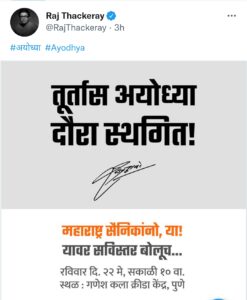 मनसे अध्यक्ष राज ठाकरे यांचा अयोध्या दौरा स्थगित करण्यात आला आहे . त्याबाबतची माहिती त्यांनी ट्विट करुन दिली आहे . तुर्तास अयोध्या दौरा स्थगित असे त्यांनी ट्विटमध्ये म्हटले आहे .