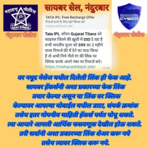 सध्या सोशल मीडियावर आयपीएल मध्ये गुजरात टीम जिंकल्या बद्दल टाटातर्फे 599 चा रिचार्ज फ्री अशा आशयाचे मेसेज फिरत आहेत.तो मॅसेज खोटा असून सायबर चोरटे नागरिकांना सध्या फसविण्यासाठी वेगवेगळ्या युक्त्या क्लृप्त्या वापरत आहेत. नागरिकांना आमीष दिले जाते आणि त्यातून नागरिकांची फसवणूक झाल्याच्या घटना घडल्या आहेत.कृपया अशा संदेशांच्या लिंक उघडू नयेत. त्यामुळे फोन हॅक होण्याचा किंवा प्रसंगी आर्थिक नुकसान होण्याची देखील शक्यता आहे.