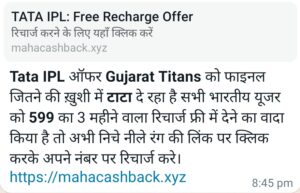दोन दिवसांपूर्वी आयपीएल मध्ये गुजरात टीम जिंकल्या बद्दल टाटातर्फे 599 चा रिचार्ज फ्री अशा आशयाचे मेसेज फिरत आहेत.अशा आमीषाला तुम्ही बळी पडत असाल तर सावधान!