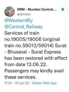 दरम्यान, गाडी क्र. १९००५/१९००६ सुरत भुसावळ एक्सप्रेस ही ८ व ९ जून रोजी नियमित सुरु होणार होती. याबाबत मध्य रेल्वेने ६ जून रोजी नोटीफिकेशन जारी केले होते.