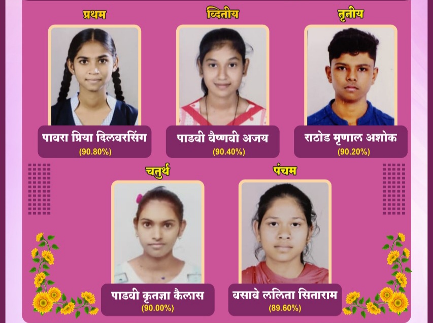 या परीक्षेत पावरा प्रिया दिलवरसिंग ९०.८० टक्के, पाडवी वैष्णवी अजय ९०.४० टक्के, राठोड मृणाल अशोक ९०.२० टक्के, पाडवी कृतज्ञा कैलास ९० टक्के, वसावे ललिता सिताराम ८९.६० टक्के मिळवून या विद्यार्थ्यांनी यश प्राप्त केले.