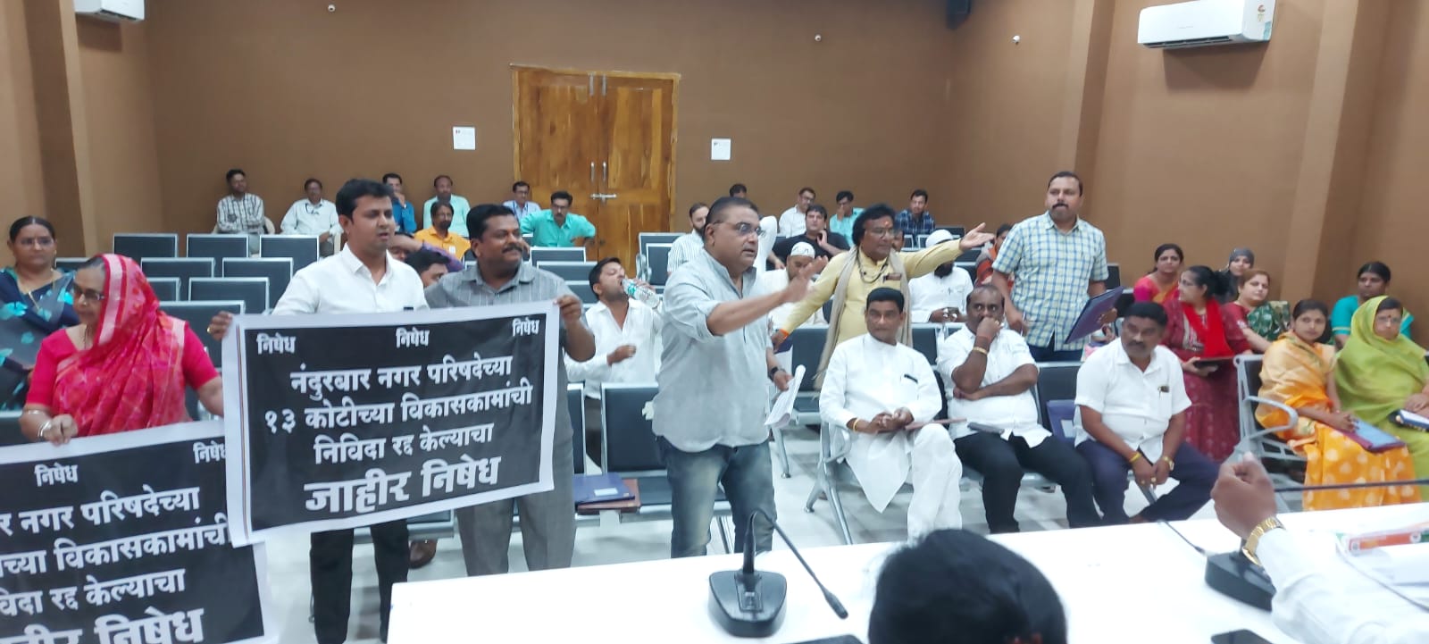 पालीकेने रद्द केलेल्या निविदामध्ये नंदुरबार शहरातील अनेक महत्वांची काम असुन आर्थिक लागेबांध्यातुनच ही निविदा प्रक्रीया रद्द करण्यात आली आहे.नंदुरबार नगरपरिषदेच्या सर्वसाधारण सभेमध्ये आज १४ कोटींच्या कामांच्या निविदा प्रक्रियेचा रद्द प्रकरणी भाजपातर्फे सभेत बॅनर झळकवीले.
