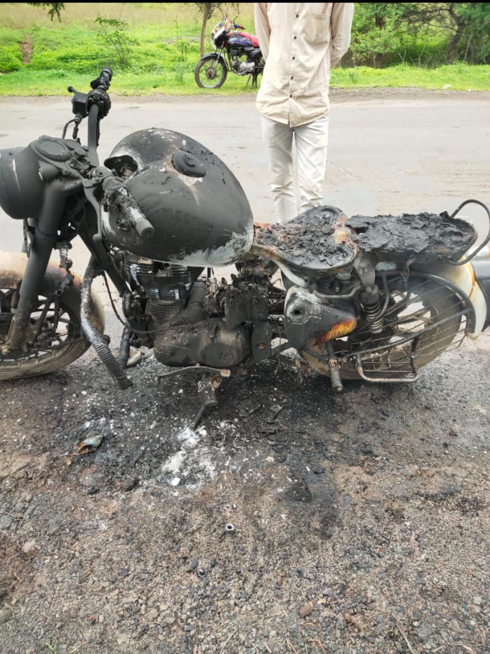 मिळालेल्या माहितीनुसार प्रकाश तिरमले रा. नितीननगर ,शहादा हे त्यांच्या पांढऱ्या रंगाच्या बुलेट मोटरसायकलने शहादा येथून शिरपुरकडे जात होते दुपारी साडे तीन वाजेच्या सुमारास दोंडाईचा – शिरपूर रोडवरील अनरद टेकडीजवल अचानक धावत्या बुलेटला आग लागून स्फोट झाला.