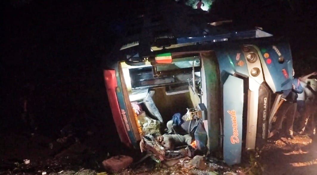 चरणमाळ घाटात खाजगी बस उलटली, दोघांचा मृत्यू, १४ प्रवासी जखमी
