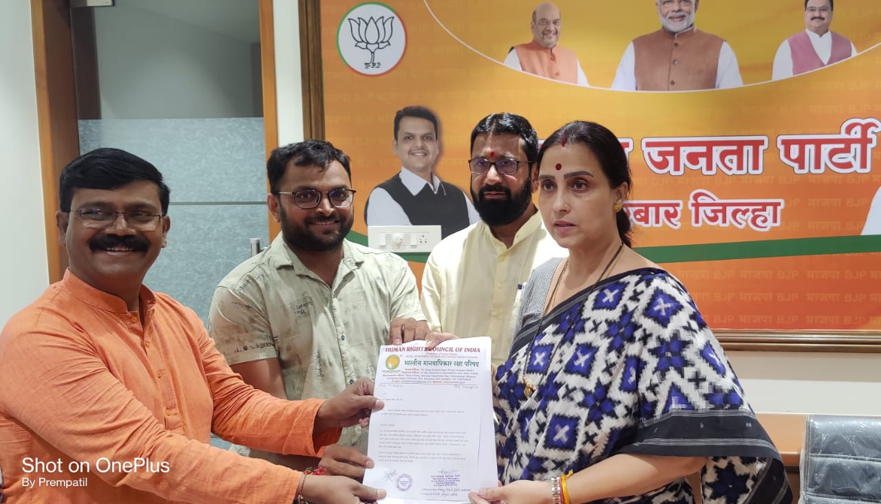 भाजपाच्या नेत्या व भाजपा प्रदेश उपाध्यक्षा चित्रा वाघ यांना खडकी तालुका धडगाव येथील विवाहितेवर सामूहिक बलात्कार करून तिची हत्या केल्याच्या प्रकरणातील आरोपी व दोषी अधिकाऱ्यांची योग्य ती चौकशी होऊन कारवाई होणे तसेच मोख तालुका धडगाव येथील पेचरीबाई जान्या वसावे यांना डाकीण ठरवून त्याचा अमानुष छळ करणाऱ्या आरोपींची योग्य ती चौकशी होऊन उचित कारवाई होणेबाबत भारतीय मानवाधिकार रक्षा परिषदेतर्फे निवेदन देण्यात आले.