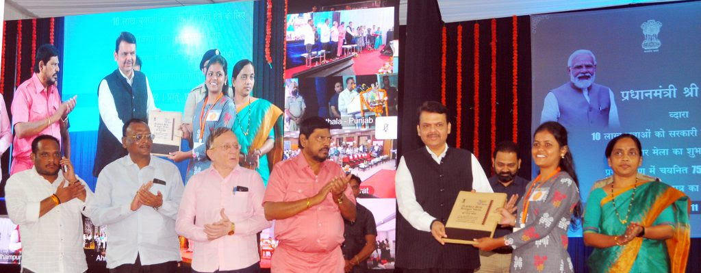 प्रधानमंत्री नरेंद्र मोदी यांच्या संबोधनानंतर देशातील विविध भागात मान्यवरांच्या हस्ते युवकांना नियुक्तीपत्रे देण्यात आली. त्यानंतर संबोधित करताना उपमुख्यमंत्री देवेंद्र फडणवीस यांनी प्रधानमंत्री नरेंद्र मोदी यांनी केंद्रात 10 लक्ष नोकरी भरतीचे लक्ष ठेवले आहे. राज्य शासनालाही अशावेळी मैदानात उतरावे लागेल. मुख्यमंत्री एकनाथ शिंदे व आपल्या नेतृत्वातील राज्य सरकारची तरुणांना नोकरी देणे ही प्राथमिकता असणार आहे. त्यामुळे वर्षभरात 75 हजार युवकांना सरकारी नोकरी दिली जाईल. त्याची सुरुवात लवकरच १८ हजार युवकांची पोलीस दलामध्ये तसेच १० हजार युवकांची ग्रामविकास विभागातील भरतीद्वारे केली जाईल, असे घोषित केले.
