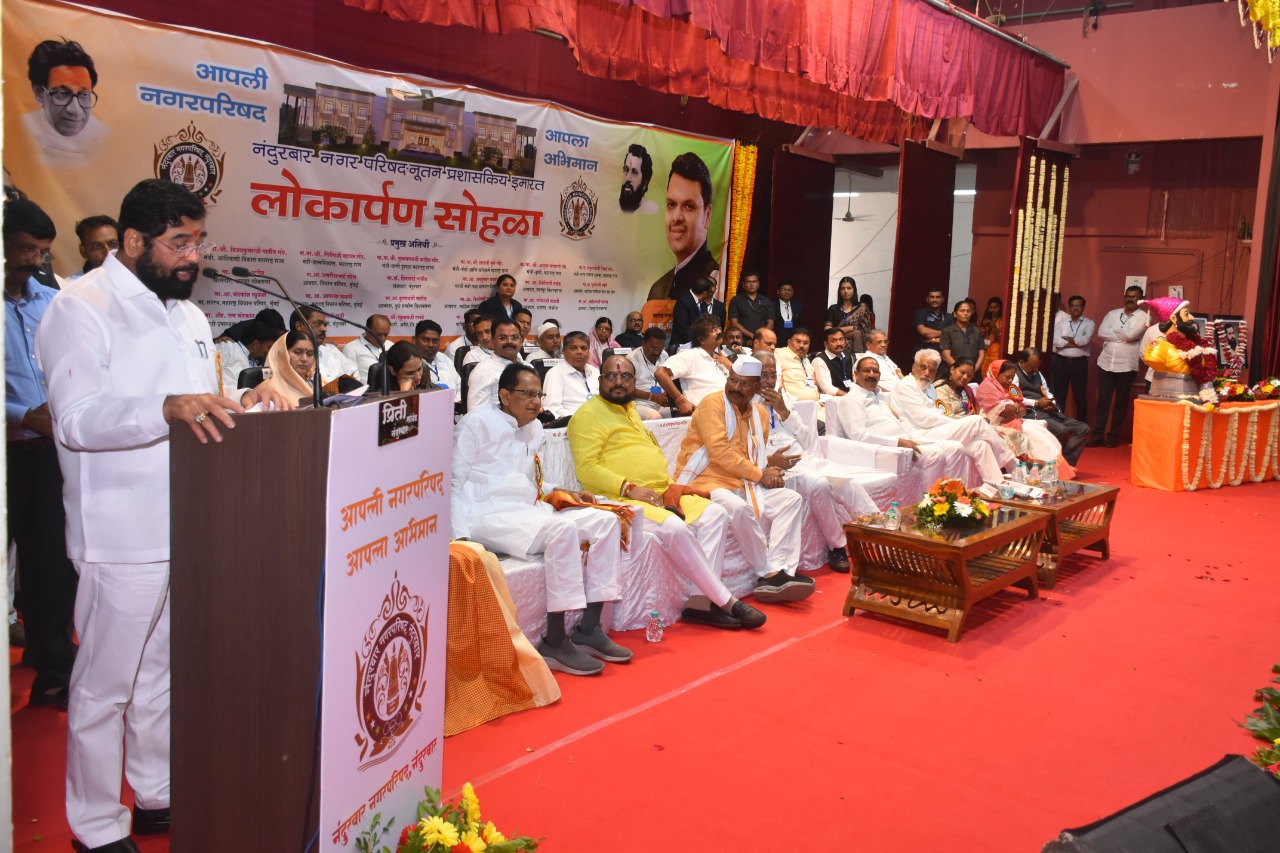 नंदुरबार नगर परिषदेच्या नुतन प्रशासकीय इमारतीचा लोकार्पण सोहळा मुख्यमंत्री श्री. शिंदे यांच्या हस्ते संपन्न झाला. यावेळी श्री. छत्रपती शिवाजी महाराज नाट्य मंदीर येथे ते बोलत होते. कार्यक्रमास आदिवासी विकास मंत्री तथा नंदुरबार जिल्ह्याचे पालकमंत्री डॉ.विजयकुमार गावीत, पाणीपुरवठा व स्वच्छता मंत्री गुलाबराव पाटील, कृषि मंत्री अब्दुल सत्तार, बंदरे आणि खनिकर्म मंत्री दादाजी भूसे, खासदार डॉ. हिना गावीत, खासदार राजेंद्र गावीत, आमदार किशोर दराडे, आमदार किशोर पाटील, आमदार मंजुळाताई गावीत, आमदार राजेश पाडवी, आमदार शिरीष नाईक,