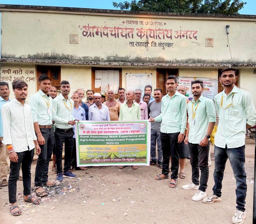 शहादा परिसरातील अनरद येथे महात्मा फुले कृषी विद्यापीठ राहुरी संलग्न पूज्य साने गुरुजी विद्या प्रसारक मंडळाचे के. व्ही. पटेल कृषी महाविद्यालय, शहादा (नंदुरबार) येथील कृषिदुतांचे आगमन झाले.