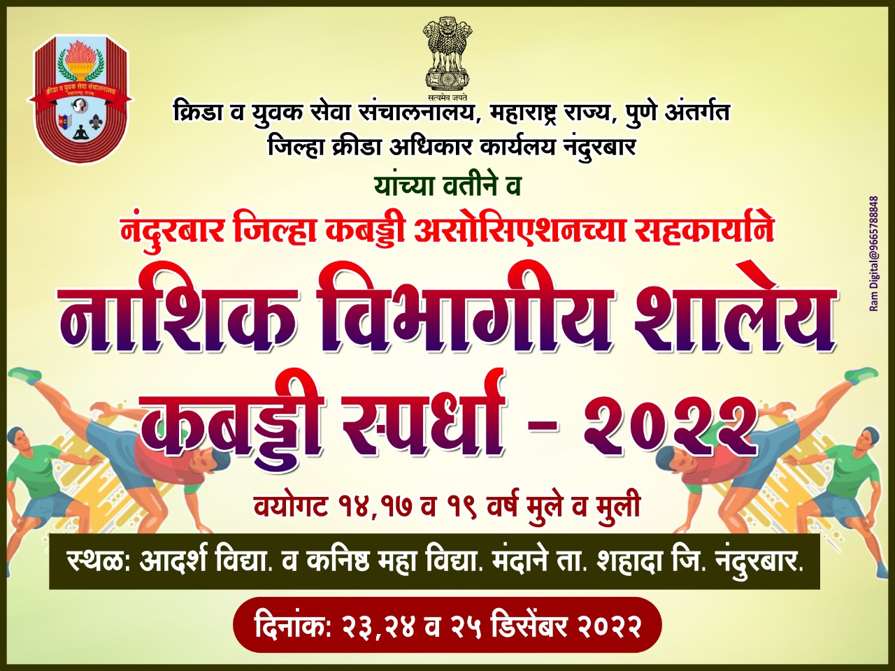 क्रीडा व युवक सेवा संचालनालय महाराष्ट्र राज्य, पुणे अंतर्गत जिल्हा क्रीडा अधिकारी कार्यालय यांच्या वतीने नंदुरबार जिल्हा कबड्डी असोसिएशनच्या सहकार्याने नाशिक विभागीय शालेय कबड्डी स्पर्धा २०२२ च्या आजपासून दिनांक २३ डिसेंबर २०२२ रोजी शहादा तालुक्यातील मंदाणे येथील आदर्श विद्यालय येथे होणार आहे.अशा प्रकारची विभागीय क्रीडा स्पर्धच नियोजन प्रथमच नंदुरबार जिल्ह्याला मिळाले आहे आणि तो बहूमान शहादा तालुक्याला मंदाणे या गावाला मिळालेला आहे.