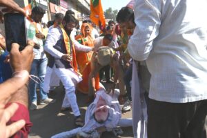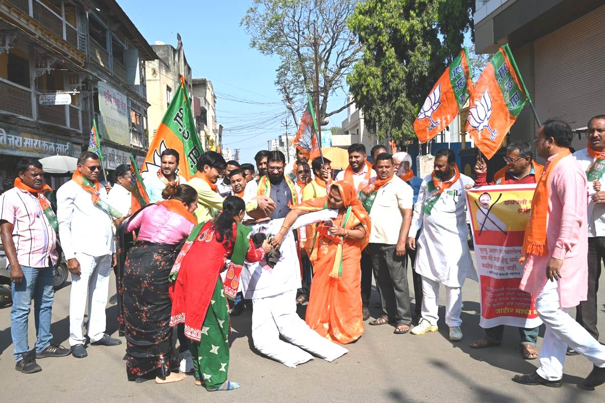 नंदुरबार येथे माजी उपमुख्यमंत्री अजित पवार यांच्या पुतळ्यास भाजपातर्फे जोडे मारून काढली धींड