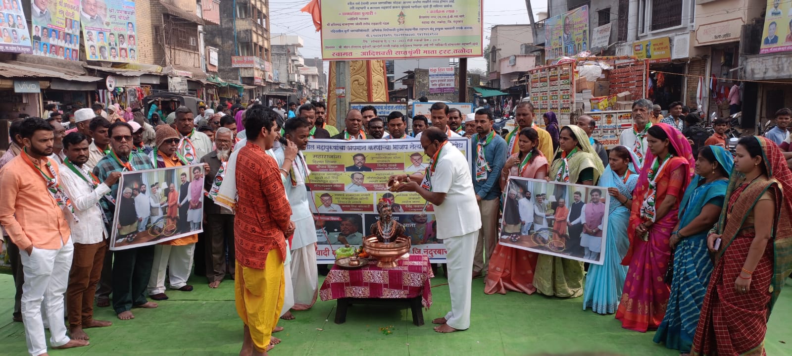 महाराष्ट्राचे विरोधी पक्ष नेते अजित दादा पवार यांच्या वर महाराष्ट्रात दोन तीन दिवसापासून भाजपाकडून तथ्यहीन निषेध नोंदवण्यात येत होता त्या निषेध आंदोलन करत्यांनी आत्मचिंतन करावे जेव्हा त्याच भापजचे खासदार,उपमुख्यमंत्री,जेष्ठ नेते,पदाधिकारी यांच्या कडून वारंवार स्वराज्यरक्षक छत्रपती शिवाजी महाराज यांचे अवमान करण्यात आल्यावर ही भाजप ची लोक कोणत्या बिळात होती,याचाच अर्थ असा समजावा की भाजप नेत्यांच्या छत्रपती शिवाजी महाराज यांच्या बद्दलच्या चुकीच्या वक्तव्यावर आंदोलन कर्त्यांचे ही समर्थन होते? त्याच पाठोपाठ महाराष्ट्राचे आराध्य दैवत स्वराज्यरक्षक छत्रपती शिवाजी महाराज यांच्या प्रतिमेला महाराष्ट्राचे कार्यकाळ संपलेले राज्यपाल भगतसिंग कोश्यारी यांनी गेल्या काही महिन्यावर महाराजांचा दोनदा अपमान करून ही माफी मागितली नसतांना त्यांनी छत्रपती शिवाजी महाराज यांच्या प्रतिमेला हात लावायचा कोणताही नैतिक अधिकार नसतांना देखील त्यांनी युपीचे मुख्यमंत्री यांना छत्रपती शिवाजी महाराज यांची मूर्ती भेट देऊन महाराजांना अपवित्र केल्या बद्दल माजी आमदार, राष्ट्रवादीचे प्रदेश उपाध्यक्ष उदेसिंग पाडवी यांच्या हस्ते महाराज सतीशजी जोशी,सोहमजी जोशी,अर्थर्वजी टोपले या तिघी ब्राह्मण देवतेच्या तर्फे पूजा अर्चना व दुग्ध अभिषेक करत शूद्धिधीकरण करून पवित्र करण्यात आले.