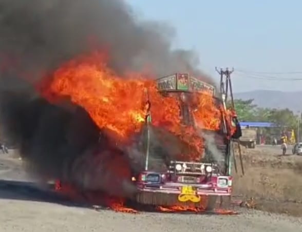 लोखंडाने भरलेल्या मालट्रकचे टायर गरम होऊन लागलेल्या आगीत ट्रक जळून खाक झाला. मात्र वेळीच चालक व सहचालकाने सावध होत पेटत्या ट्रकपासून दुर झाल्याने जिवीतहानी टळली.