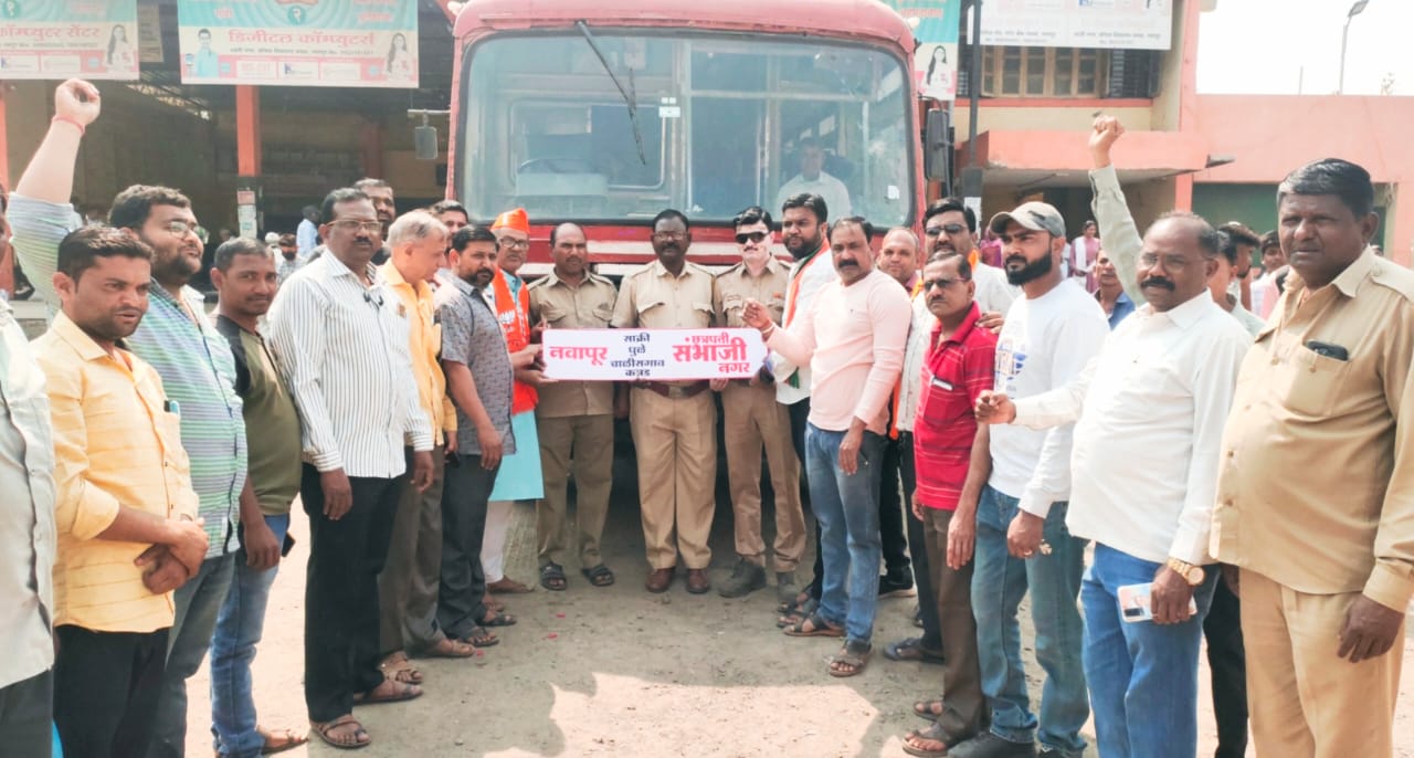 नुकतेच राज्यातील शिंदे सरकारने औरंगाबादचे नाव संभाजी नगराची घोषना करुन अधिसुचना जाहीर केल्याने आज एस टी बसस्थानकावर जाऊन भाजपाच्या कार्यकत्यांनी नवापूर-संभाजीनगर नावाची पाटी चालक व वाहक यांना सुपूर्द केली.यावेळी भाजपा कार्यकत्यांनी घोषणाबाजी करीत केंद्र व राज्य सरकारचे आभार मानले.