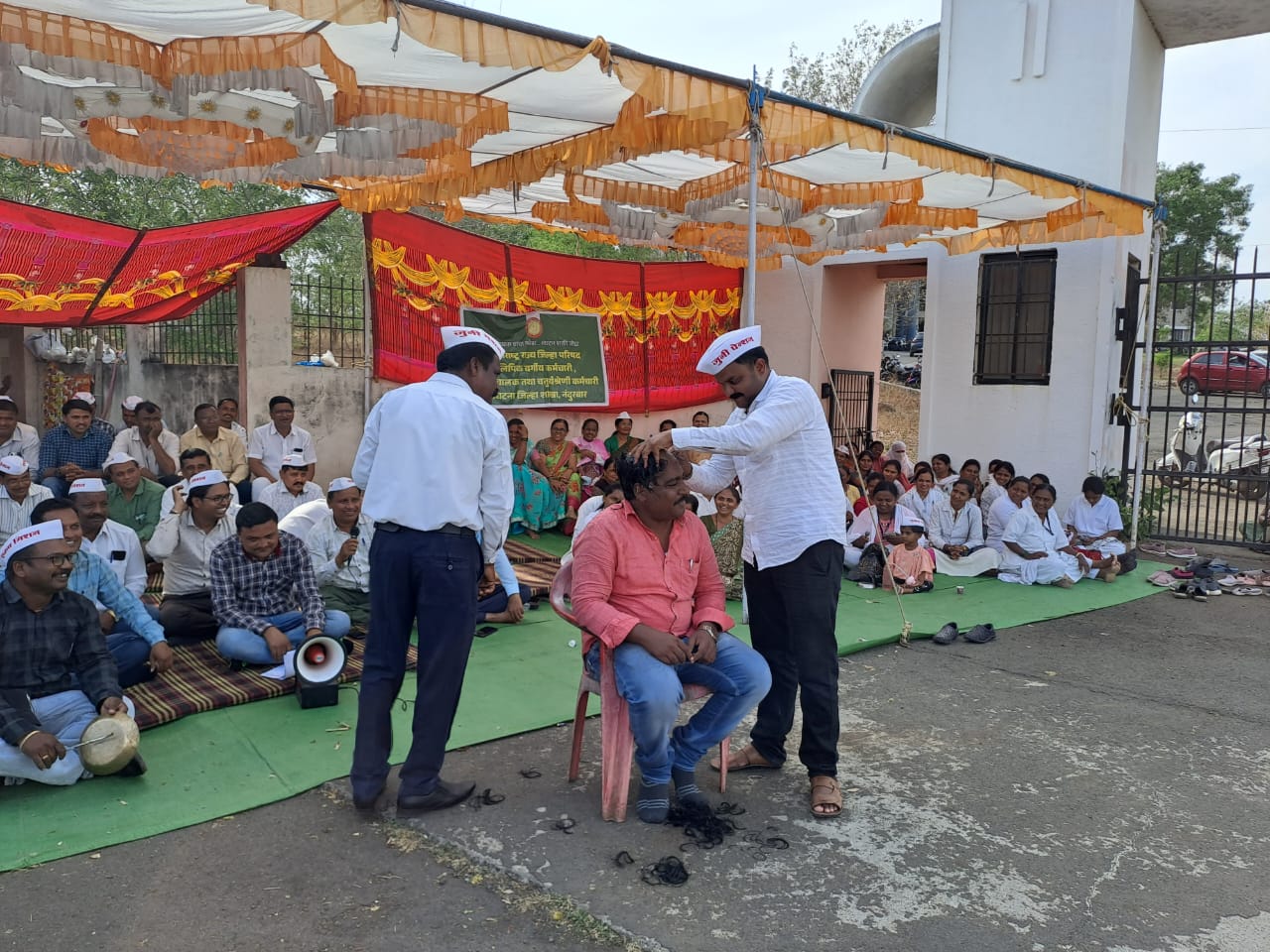नंदुरबार जिल्ह्यातील कर्मचारी जिल्हा परिषद कर्मचारी यांनी शासनाचा निषेध व्यक्त करत मुंडण आंदोलन जिल्हा परिषद समोरच सुरु केले आहे. सदर मुंडण आंदोलनाची सुरुवात जिल्हा परिषद आरोग्य विभागात कार्यरत असलेले वरीष्ठ सहाय्यक डॉ. मंगेश वाघमारे यांनी केले.
