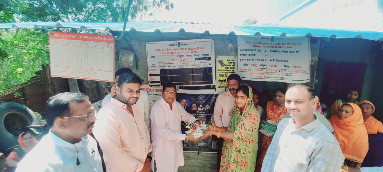 नवापुर शहरातील तीनटेंबा भागातील सरकारमान्य स्वस्त धान्य दुकानाच्या वतीने नवापुर भाजपा तालुकाध्यक्ष भरत गावित व भाजपा पदाधिकारी यांच्या हस्ते लाभार्थ्यांना आनंदाचा शिधा अंतर्गत किट वाटप करण्यात आली. याप्रसंगी नायब तहसिलदार जितेंद्र पाडवी, पुरवठा निरीक्षक खैरनार, भाजपा अल्पसंख्याक मोर्चा महाराष्ट्र प्रदेश उपाध्यक्ष एजाज शेख, हेमंत जाधव, भाजपा शहर अध्यक्ष प्रणव सोनार, शहर सरचिटणीस अजय गावित, जैनू गावित, सौरव भामरे, हेमंत शर्मा, गोपी सैन, रसूल पठाण आदींसह स्थानिक लाभार्थी उपस्थित होते.