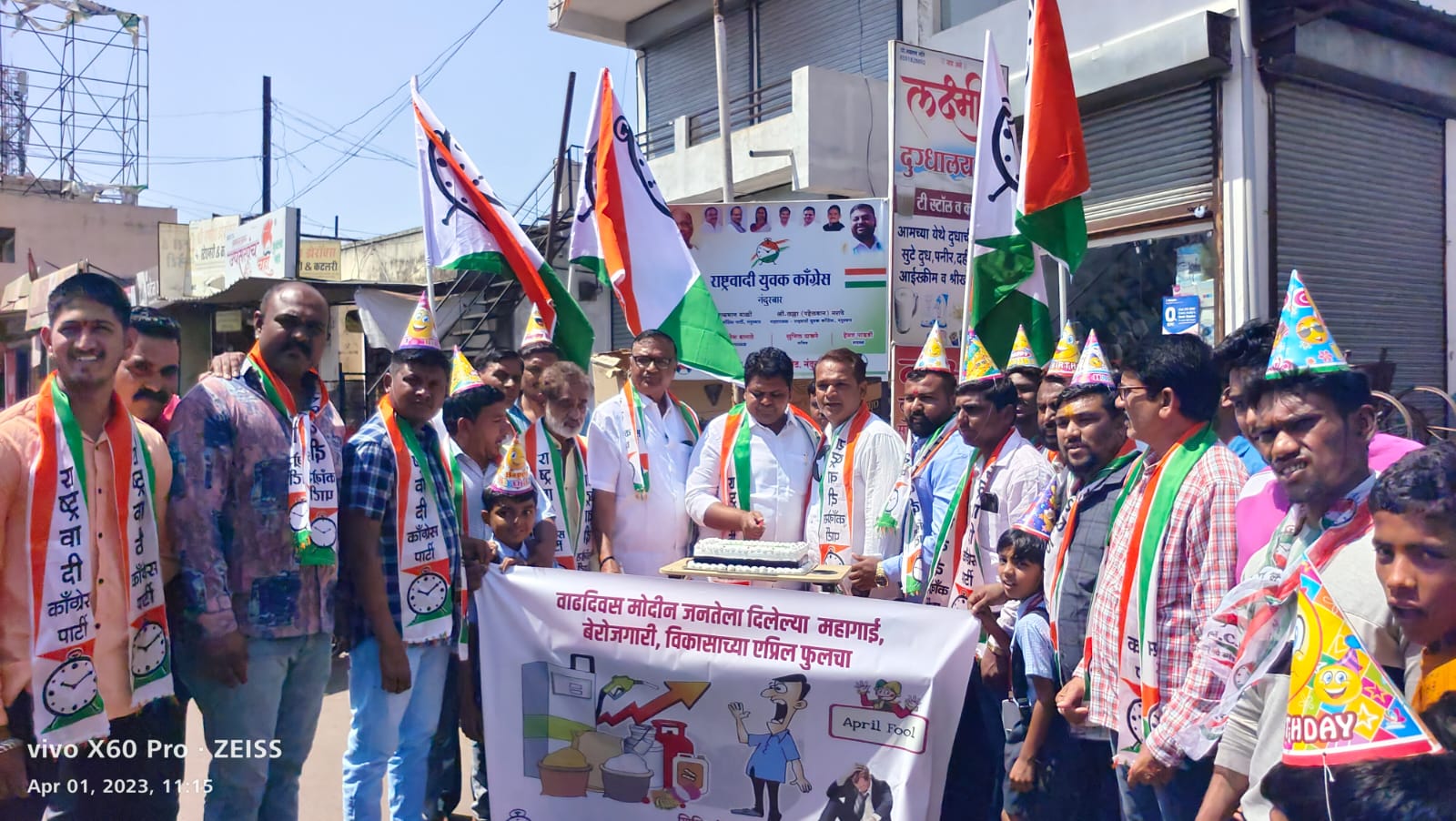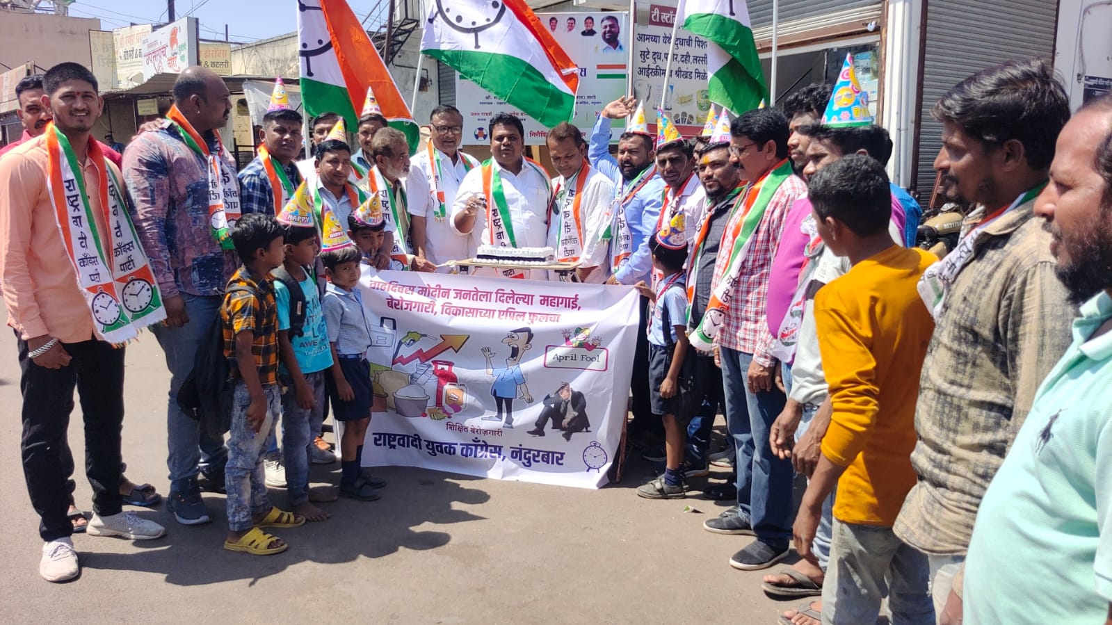 सद्याच्या स्थितीत देशात वाढती बेरोजगारी, वाढती महागाई आदी समस्यांनी जनता त्रस्त झाली आहे. भारतीय जनता पक्षाने भारतीय जनता पार्टीने सत्तेत बसण्यासाठी जनतेला आश्वासनांचे लॉलीपॉप दिले आहे. विकासाच्या नावाखाली मोदी सरकारने जनतेला एप्रिल फुल बनविले आहे. याचा निषेध नंदुरबार शहर राष्ट्रवादी युवक कॉंग्रेसतर्फे केप कापून मोदी विकास म्हणजे फसवा विकास म्हणून मोदी विकासाचा वाढदिवस साजरा करुन एक प्रतिकात्मक आंदोलन करण्यात आले. यावेळी एप्रिल फुल मोदी गुल तसेच वाढती बेरोजगारी, महागाई विरोधी कार्यकर्त्यांनी घोषणा दिल्या.