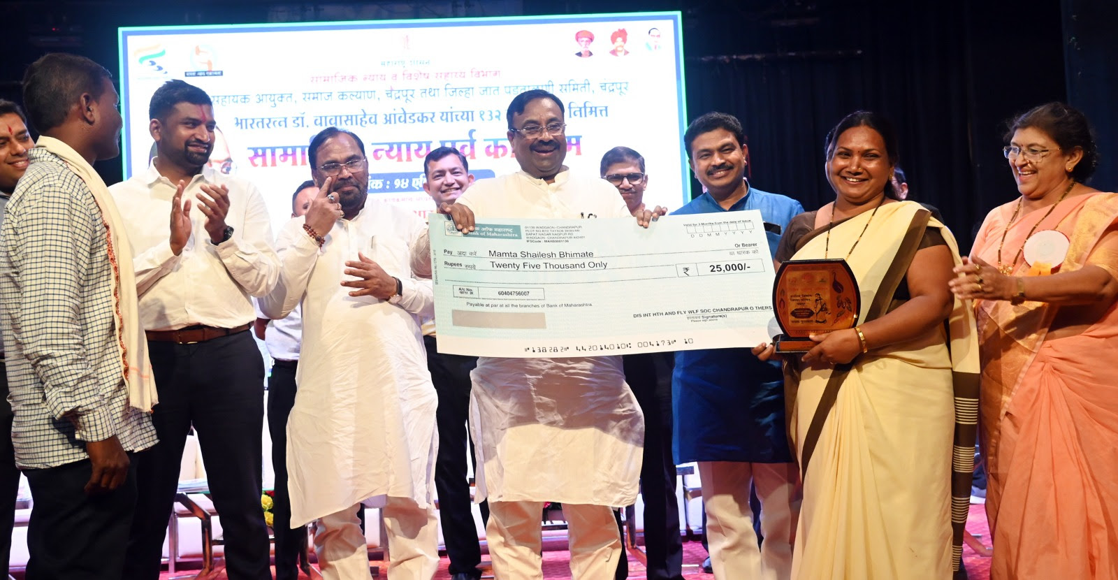 सामाजिक न्याय पर्वानिमित्त पालकमंत्र्यांच्या हस्ते विविध योजनेंतर्गत लाभार्थींना धनादेश / प्रमाणपत्र / साहित्य वाटप करण्यात आले. यात अतिवृष्टीमुळे अंशत: घराचे नुकसान झालेल्या आबाजी भोयर, दिवाकर धांडे यांना तर राष्ट्रीय कुटुंब अर्थसहाय्य योजनेंतर्गत अर्चना रायपुरे यांना धनादेश देण्यात आला. यशवंतराव चव्हाण मुक्त वसाहत योजनेंतर्गत प्रदीप गदेकार, पांडूरंग मंढरे, राकेश मांडवगडे यांना धनादेश, महाज्योती जेईई / नीट पूर्व प्रशिक्षण टॅब वाटप अंतर्गत श्रद्वा मल्लेलवार, गौरव भागडे यांना टॅब वितरण करण्यात आले. मिनी ट्रॅक्टर योजनेंतर्गत दीपस्तंभ युवा बचत गट, संकल्प पुरुष बचत गट यांना धनादेश, तुषार राहुलगडे आणि वैष्णवी तुराणकर यांना जातवैधता प्रमाणपत्र, सचिंद्र उईके यांना दिव्यांग शेतकऱ्यांना शेतीपूरक व्यवसायासाठी अर्थसहाय्य, सुभाष मानकर यांना रमाई आवास योजना, कविता उईके यांना प्रधानमंत्री आवास योजना, गोरगबाबा आत्राम यांना शबरी आवास योजनेच्या लाभाचे प्रमाणपत्र, माझी कन्या भाग्यश्री योजनेंतर्गत मेधस्वी कोठारे यांना प्रमाणपत्र अशा विविध योजनांच्या एकूण ३१ लाभार्थींना धनादेश / प्रमाणपत्राचे वाटप करण्यात आले.