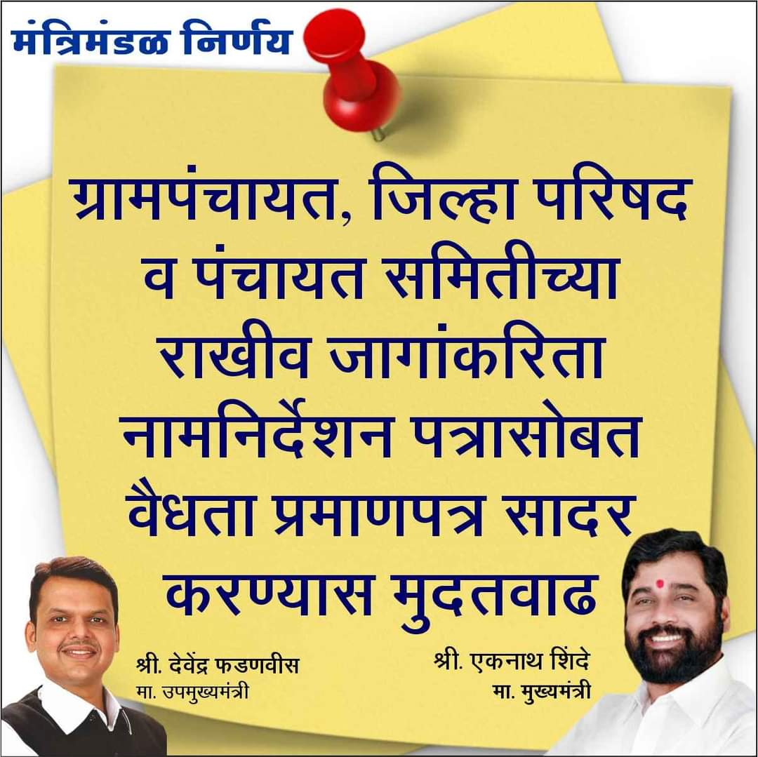 ग्रामपंचायत, जिल्हा परिषद व पंचायत समितीच्या राखीव जागांकरिता नामनिर्देशन पत्रासोबत जात वैधता प्रमाणपत्र सादर करण्यास मुदतवाढ देण्याचा निर्णय आज झालेल्या मंत्रिमंडळ बैठकीत घेण्यात आला. बैठकीच्या अध्यक्षस्थानी मुख्यमंत्री एकनाथ शिंदे होते.