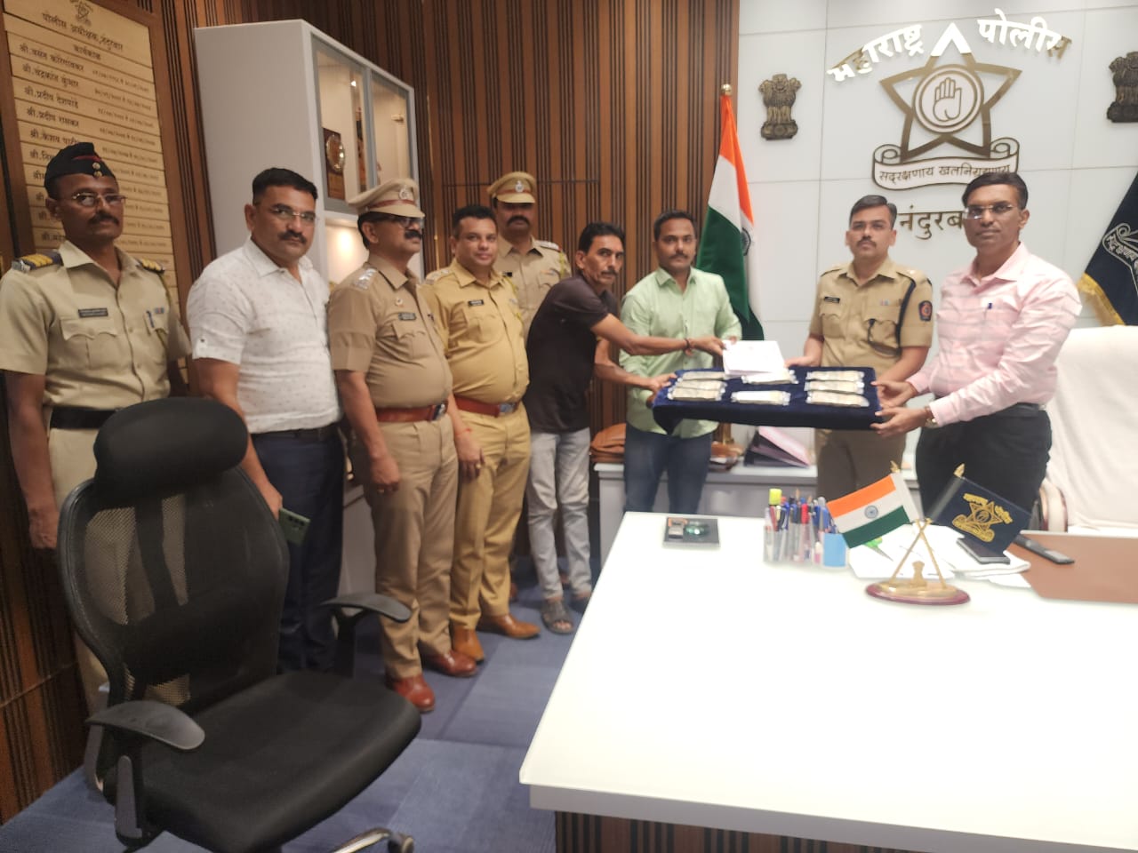मध्य प्रदेश राज्यात जावून आरोपीता ताब्यात घेवून गुन्ह्यातील चोरीस गेलेले 4 लाख रुपये हस्तगत करुन उत्कृष्ट कामगिरी करणाऱ्या स्थानिक गुन्हे शाखा व नवापूर पोलीस ठाण्याच्या पथकास पोलीस अधीक्षक पी. आर. पाटील यांनी रोख बक्षिस जाहीर केले.