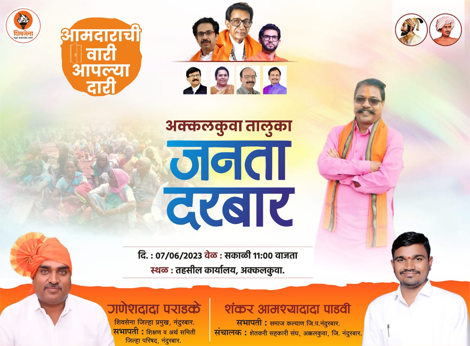 विधान परिषदेचे सदस्य आमदार आमश्या पाडवी यांच्या संकल्पनेतून आमदाराची वारी आपल्या दारी या उपक्रमांतर्गत सामान्य जनतेच्या विविध समस्या सोडविण्यासाठी दि.7 जुन रोजी अक्कलकुवा तहसील कार्यालयात जनता दरबाराचे आयोजन करण्यात आले आहे या जनता दरबारात तालुक्यातील सर्व विभागांचे वरिष्ठ अधिकारी त्यांचे अधिनस्त कर्मचारी हे उपस्थित राहुन आपल्या विभागाचा आढावा सादर करणार आहेत.