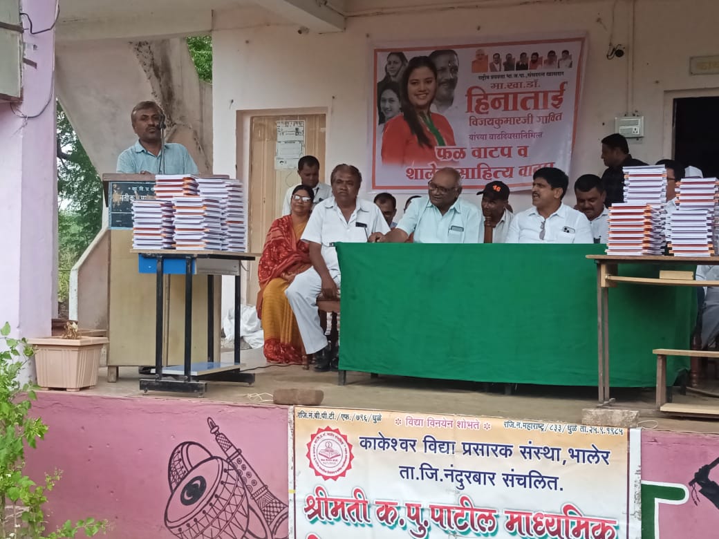 काकेश्वर विद्या प्रसारक संस्था भालेर संचलित श्रीमती क.पु.पाटील माध्यमिक व उच्च माध्यमिक विद्यालयातील सर्व विद्यार्थ्यांनाशालेय साहित्य वाटप कार्यक्रमास जि.प.सदस्य शांताराम पाटील संस्थेचे अध्यक्ष भास्करराव पाटील यांनी विद्यार्थ्यांसाठी खा. डॉ. हिना गावित वाढदिवसानिमित्त शालेय साहित्य (वह्या पेन) वाटप केले. त्यावेळी भारतीय जनता पक्षाचे तालुकाध्यक्ष जितेंद्र पाटील , संस्थेचे उपाध्यक्ष चंद्रशेखर पाटील,