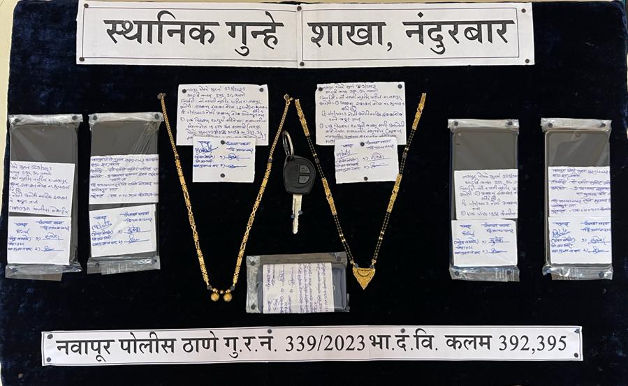 दि. 11 जुलै 2023 रोजी दुपारी 13 वाजेच्या सुमारास महिला रजनी सुधीर पाटील रा.जनतापार्क लिंकरोड नवापुर यांच्या दुकानात दोन अज्ञात इसमांनी त्यांच्या दुकानात खरेदी करण्याच्या बहाण्याने त्यांना बोलण्यांत गुंतवुन ठेवून दोन अज्ञात इसमांपैकी एका इसमाने त्यांच्या गळयातील सोन्याची मंगलपोत ही जबरीने ओढुन नेल्याने त्यांनी नवापुर पोलीस ठाण्यात गुन्हा दाखल केला पोलीस अधीक्षक पी. आर. पाटील यांनी स्थानिक गुन्हे शाखेचे दोन वेगवेगळे पथके तयार करुन घडलेल्या गुन्ह्याचा समांतर तपास करुन गुन्हा उघडकीस आणून गुन्ह्यातील आरोपी व मुद्देमाल हस्तगत करणेबाबत आदेशीत केले.