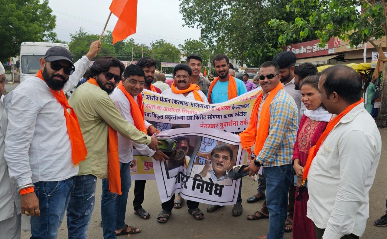 भाजपाचे माजी खा किरीट सोमय्या यांनी सोशल मीडियावर आक्षेपार्ह व्हिडिओ पोस्ट केला होता या व्हिडिओचा सर्वत्र निषेध नोंदविला जात असून या निषेधार्थ उद्धव बाळासाहेब ठाकरे गट युवासेना प्रमुख आमदार आदित्य ठाकरे, यांच्या आदेशान्वये युवा सेनेचे सचिव वरून सरदेसाई, विभागीय सचिव विराज कावडीया ,नंदुरबार जिल्हा विस्तारक कुणाल कानकाटे, यांच्या मार्गदर्शनाखाली युवा सेनेचे जिल्हाअधिकारी अर्जुन मराठे यांच्या नेतृत्वात आज नंदुरबार शहरातील दिनदयाळ चौकात उद्धव बाळासाहेब ठाकरे शिवसेना गटाच्या वतीने माजी खा किरीट सोमय्या यांच्या प्रतिमेला जोडो मारो आंदोलन करण्यात येऊन त्यांच्या विरोधात घोषणा देण्यात आल्या व तीव्र निषेध व्यक्त करण्यात आला.