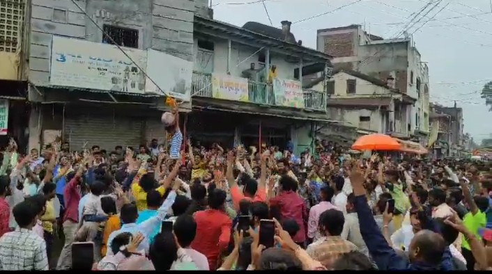 “आला रे आला गोविंदा आला” च्या जयघोषात नंदुरबार शहरातील सुभाष चौक मैदानात कै. शांतीसागर सुपडू पैलवान यांची जय बजरंग व्यायाम शाळा आयोजित दहीहंडी उत्सवात शहरातील बारा व्यायाम शाळांच्या गोविंदांनी दहीहंडी फोडून उत्सव साजरा केला.
