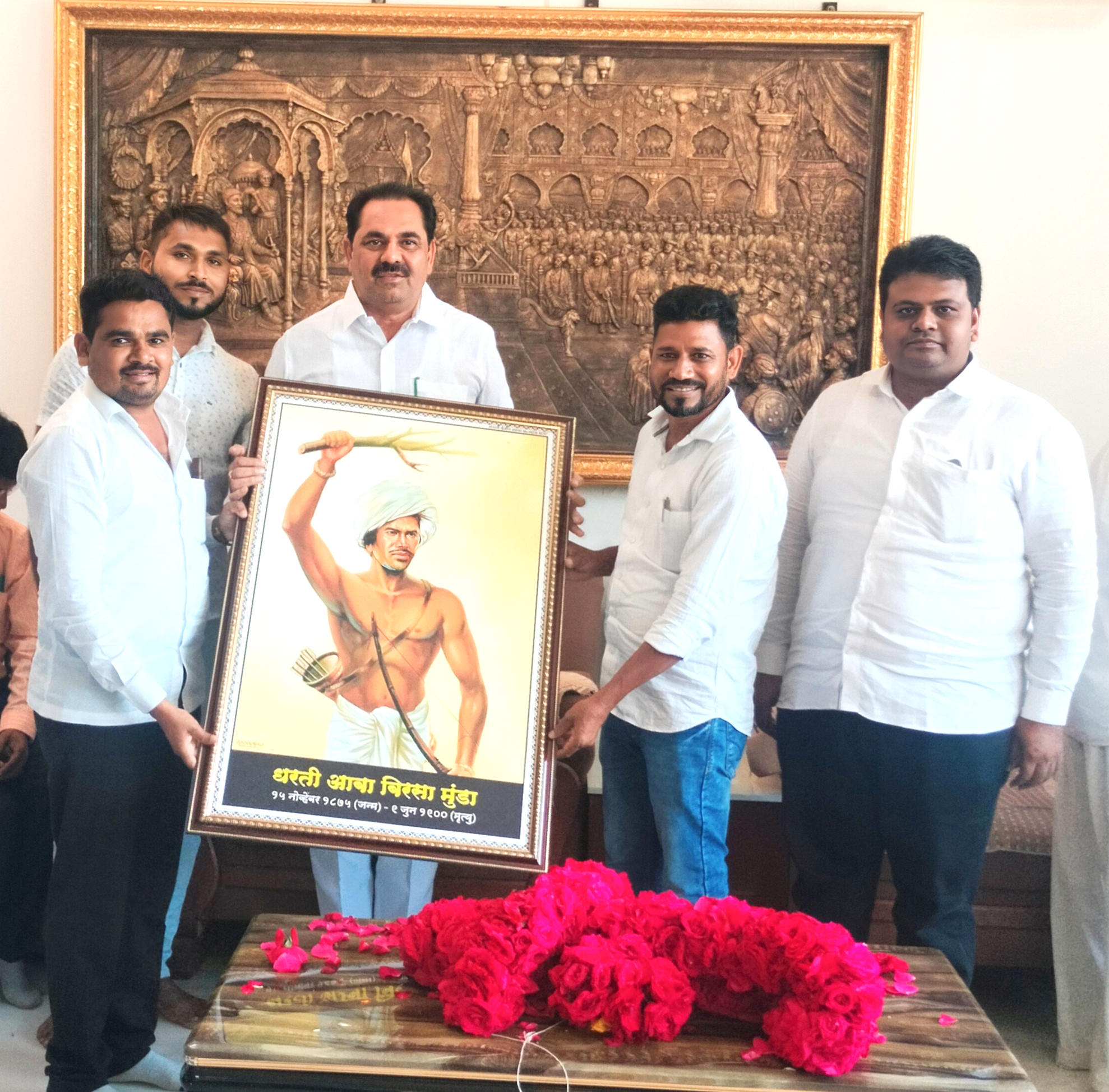 यावेळी आदिवासी समाजाचे दैवत असलेले क्रांतीवीर बिरसा मुंडा यांची भव्यदिव्य असलेली आकर्षक प्रतिमा नंदुरबारचे पालकमंत्री अनिल पाटील यांना राष्ट्रवादी युवक काँग्रेसचे नंदुरबार जिल्हाध्यक्ष सिताराम पावरा यांनी दिली. याप्रसंगी राष्ट्रवादी काँग्रेसचे नंदुरबार जिल्हाध्यक्ष डॉ.अभिजीत मोरे, जि.प.सदस्य मोहन शेवाळे व राष्ट्रवादी युवक काँग्रेसचे सर्व पदाधिकारी, कार्यकर्ते उपस्थित होते. नंदुरबार जिल्ह्याचे पालकमंत्री पदाची जबाबदारी ही राष्ट्रवादी काँग्रेस पक्षाच्या मंत्री सोपविण्यात आल्याने राष्ट्रवादी काँग्रेसच्या पदाधिकारी व कार्यकर्त्यांनी आनंद व्यक्त करण्यात आला.