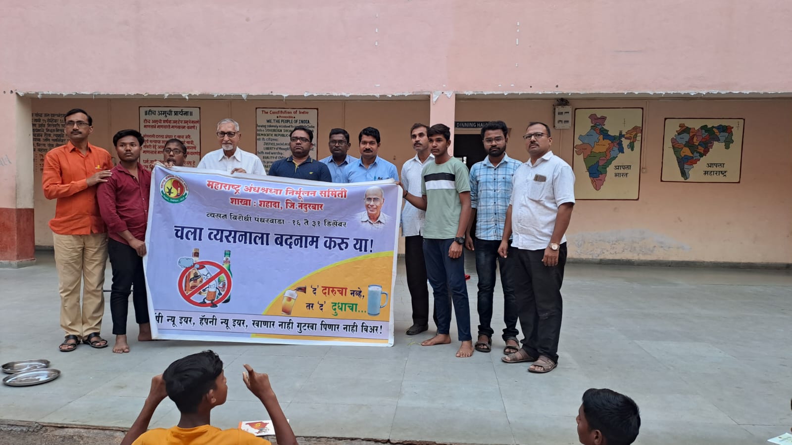 नवीन वर्षाच्या अखेरच्या दिवशी विद्यार्थ्यांनी” द दारूचा नव्हे, द दुधाचा ” म्हणत, व्यसनविरोधी संकल्प घेतला. महाराष्ट्र अंधश्रद्धा निर्मूलन समितीचा चला व्यसनाला बदनाम करूया या अभियान अंतर्गत या कार्यक्रमाचे आयोजन करण्यात आले. याप्रसंगी सामाजिक न्याय विभागाच्या नवबौद्ध मुलांच्या निवासी शाळेत घेण्यात आला.