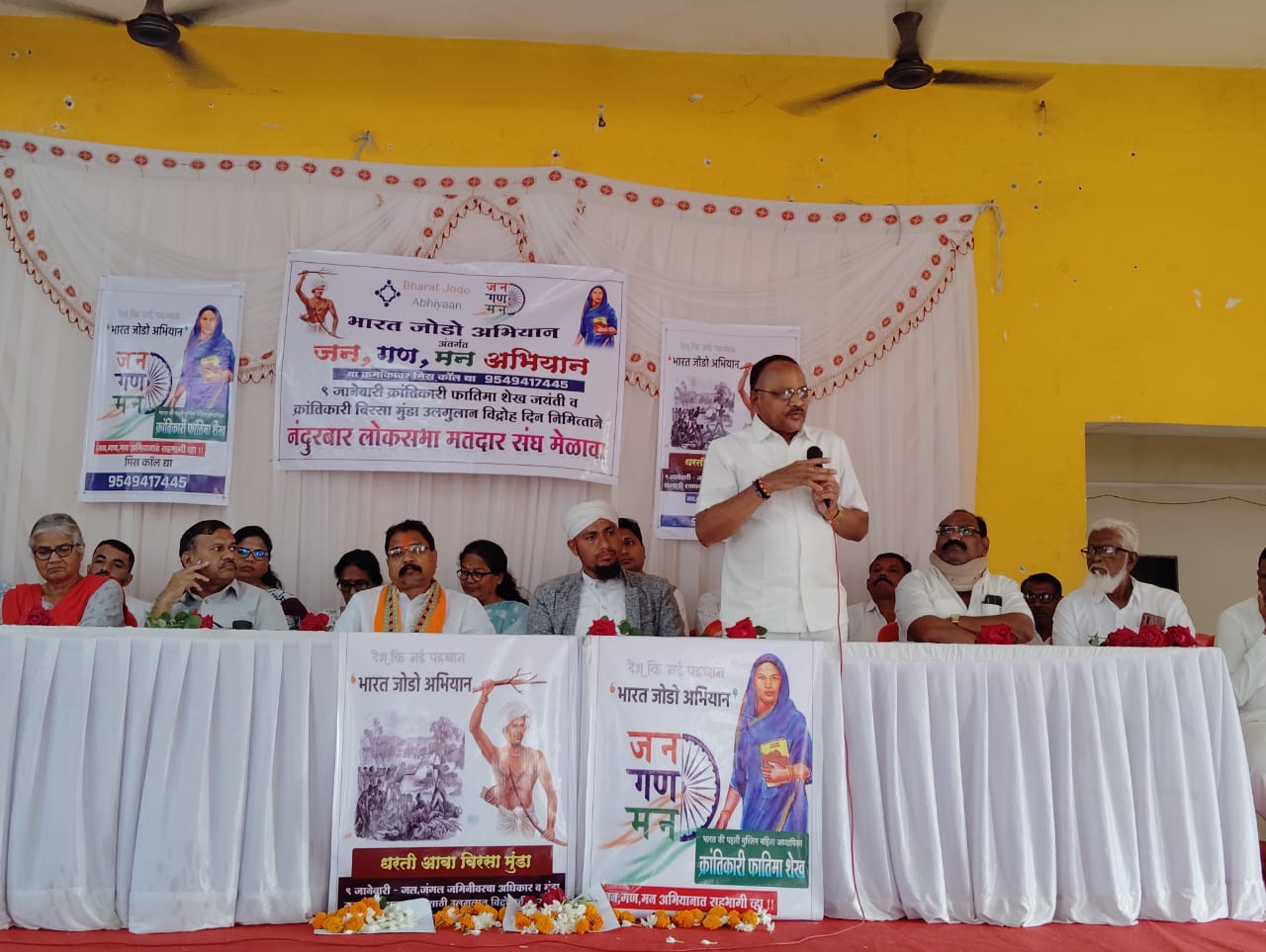 तळोदा येथील आदिवासी सांस्कृतिक भवन येथे भारत जोड़ो आभियानच्या वतीने बिरसा मुंडांच्या उलगुलान विद्रोह दिन व फातिमा शेख यांच्या जयंती निमित्ताने नंदुरबार लोकसभा मतदार संघातिल कार्यकर्ते व नागरिकांचा मेळावा संपन्न झाला या मेळाव्यात दिलेल्या क्रमांकावर मिस कॉल देवून जन गण मन अभियानात सहभागी होण्याची मोहिम सुरु केली गेली.