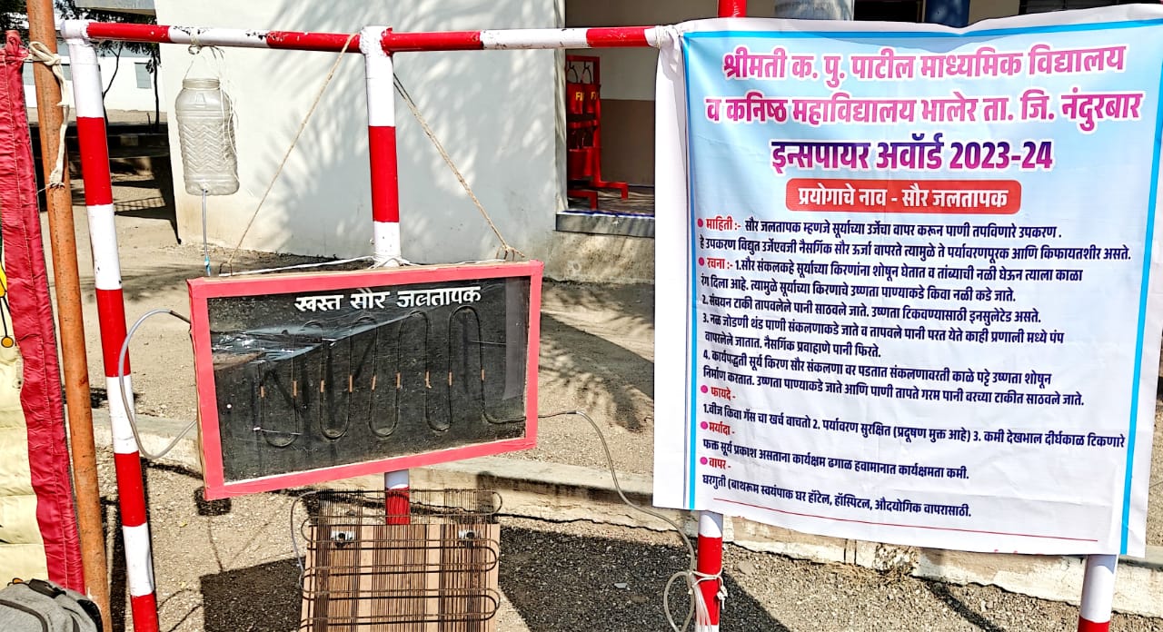 भालेर ता.. नंदुरबार येथील श्रीमती क. पु. पाटील माध्यमिक विद्यालयातील आठवीच्या विद्यार्थ्यांनी तयार केलेले सौर जलतापक अभिनव वैज्ञानिक उपकरण थेट इन्स्पॉयर अवॉर्ड २०२३_२४ मध्ये राज्यस्तरीय स्पर्धेसाठी निवडले जाऊन गावाचे व शाळेचे तसेच नंदुरबार जिल्ह्याचे नाव राज्य पातळीवर उज्वल केले आहे.