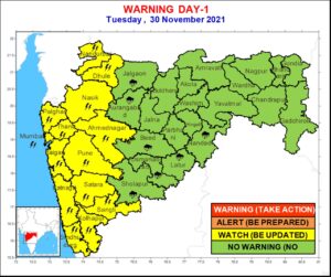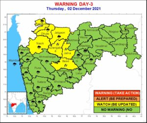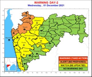 तसेच जिल्ह्यात 1 डिसेंबर व 2 डिसेंबर 2021 रोजी वादळीवारा (ताशी 30 ते 40 कि.मी ), विजांच्या कडकडाटासह अवकाळी पाऊस होण्याची शक्यता होणार असल्याने शेतीमालाचे नुकसान टाळण्यासाठी शेतकऱ्यांनी आपला शेतमाल सुरक्षित ठिकाणी साठवुन ठेवावा. बाजार समितीमध्ये शेतमाल विक्रीसाठी आणला असेल किंवा त्याप्रमाणे नियोजन केले असेल, तर मालाचे नुकसान होणार नाही अशी काळजी घ्यावी. विजा, गारांपासून बचावासाठी सुरक्षित ठिकाणी आश्रय घ्यावा. मोकळे मैदान, झाडाखाली, वीज वाहिनी अथवा ट्रॉन्सफॉर्मजवळ थांबू नये, वादळी वारे पासुन संरक्षणासाठी भाजीपाला, मिरची, पपई,केळी इत्यादी पिकांना आधार देण्याची व्यवस्था करावी. पक्वता अवस्थेत असलेल्या पिकांची काढणी करुन सुरक्षित ठिकाणे ठेवावीत. पथारीवर वाहत ठेवलेली मिरची सुरक्षित ठिकाणी झाकुन ठेवावी, असे आवाहन जिल्हा आपत्ती व्यवस्थापन प्राधिकरणाचे मुख्य कार्यकारी अधिकारी तथा निवासी उपजिल्हाधिकारी सुधीर खांदे यांनी केले आहे.