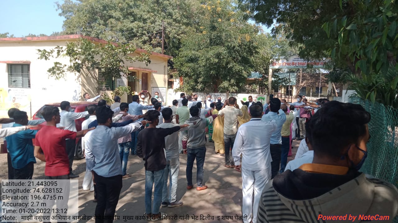 यावेळी मुख्य कार्यकारी अधिकारी रघुनाथ गावडे व उपस्थित अधिकारी यांनी ग्रामपंचायतीमार्फत लावण्यात वृक्षांची पाहणी केली. तसेच स्वच्छ भारत मिशन ग्रामीण अंतर्गत गावात सुरु असलेल्या सांडपाणी व घनकचरा व्यवस्थापन कामांची पाहणी केली. या नंतर वृक्ष मंदिर येथे भेट देऊन लोकसहभागातून लावण्यात आलेल्या विविध वृक्षांचे पाहणी करून त्यांची अद्यावत माहिती दप्तरी कसे ठेवावी याविषयी मार्गदर्शन केले. तसेच ग्रामस्थांना माझी वसुंधरा अभियानांतर्गत पर्यावरण रक्षणासाठी व स्वच्छतेचे शपथ दिली. या प्रसंगी सरपंच मनोज चौधरी, विस्तार अधिकारी मनोज देव, ग्रामसेवक मनीष रामोळे, जिल्हा कार्यक्रम व्यवस्थापक सुनील पाटील आदींसह ग्रामपंचायतीचे सदस्य व ग्रामस्थ मोठ्या संख्येने उपस्थित होते.