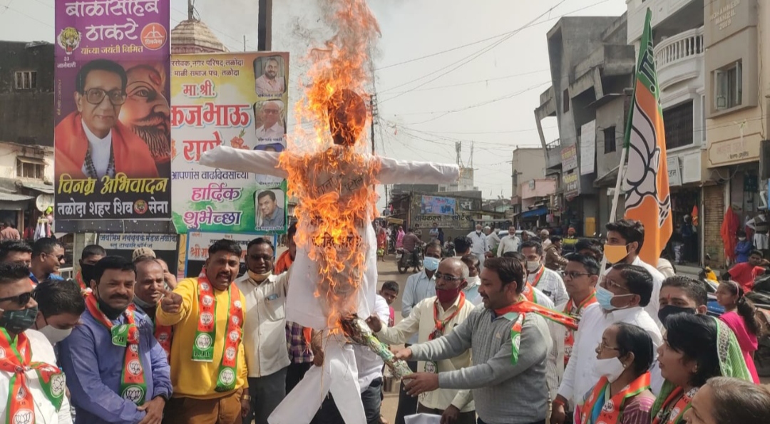 पंतप्रधान नरेंद्र मोदी यांच्या बद्दल अभद्र वक्तव्य करणाऱ्या महाराष्ट्र प्रदेश काँग्रेसचे अध्यक्ष नाना पटोले यांच्या प्रतिकात्मक पुतळ्याला जोडे मारा आंदोलन व पुतळा दहन तळोदा येथील स्मारक चौक येथे शहर भारतीय जनता पार्टी यांनी केले.