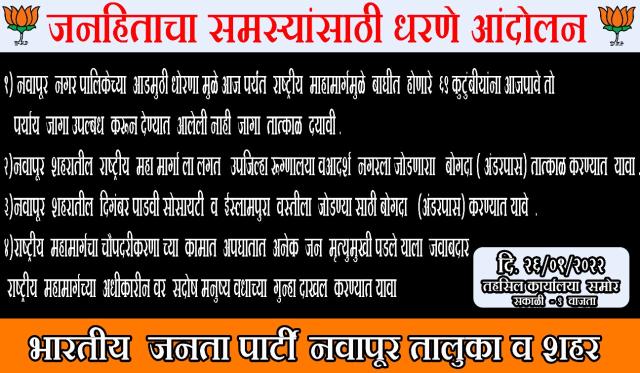 दि. २६ जानेवारी प्रजासत्ताक दिनाच्या दिवशी सकाळी ९ वाजता नवापूर नगर पालिका हद्दीतील राष्ट्रीय महामार्गत बाधित होणाऱ्या 69 कुटूंबियांना पर्यायी जागा मिळणे व उपजिल्हा रुग्णालय समोर D P रोड ला जोडून राष्ट्रीय महामार्गावर भुयारी मार्ग करणे तसेच इस्लामपुरा व दिगंबर पाडवी सोसायटीला जोडण्यासाठी भुयारी मार्ग करण्या बाबत वारंवार निवेदन देऊन देखील प्रशासन कुंभकर्णी निद्रेतुन उठायला तयार नाही.म्हणून या समस्येचा निराकरण व्हावे म्हणून नगर पालिका प्रशासन व राष्ट्रीय महामार्ग अधिकारी यांना जागे करण्यासाठी भाजपातर्फे धरणे आंदोलन होणार आहे.या जनहिताच्या कामासाठी होणाऱ्या आंदोलनात नवापूर शहरातील भारतीय जनता पार्टीच्या प्रदेश पदाधिकारी,प्रदेश सदस्य,आजी-माजी जिल्हा पदाधिकारी,नगरसेवक, युवा मोर्चा , पदाधिकारी,शहर पदाधिकारी व सर्व कार्यकर्त्यांनी उपस्थित रहावे असे आवाहन भाजपा तालुकाध्यक्ष भरत माणिकरावजी गावीत, शहराध्यक्ष प्रणव सोनार यांनी केले आहे.